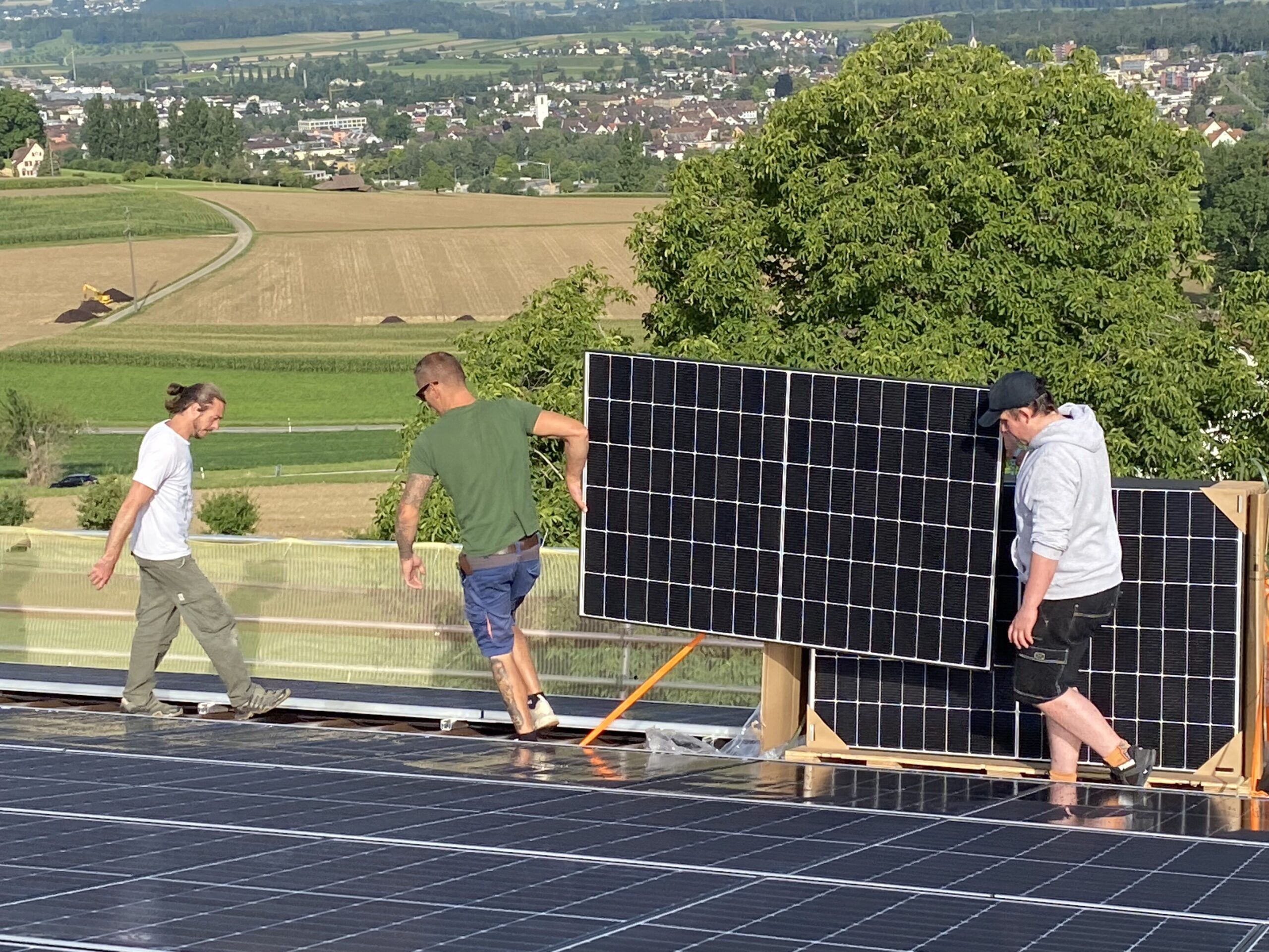 In den letzten Wochen wurde fleissig auf den Dächern gearbeitet. Das Montagesystem wurde angebracht, damit die Solarmodule befestigt werden können und mehr als 20’000 Meter Kabel wurden verlegt, damit der Strom, welchen die Module erzeugen, über die Wechselrichter ins Stromnetz geleitet wird und so zur Energieversorgung beitragen kann.